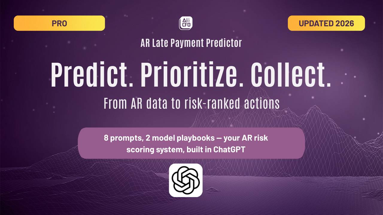 The core product. A structured ChatGPT prompt sequence that takes your AR dataset from raw invoices to a scored, ranked collections queue. Each prompt includes the exact text, what files to upload, expected output, and the decision you need to make before moving to the next step.