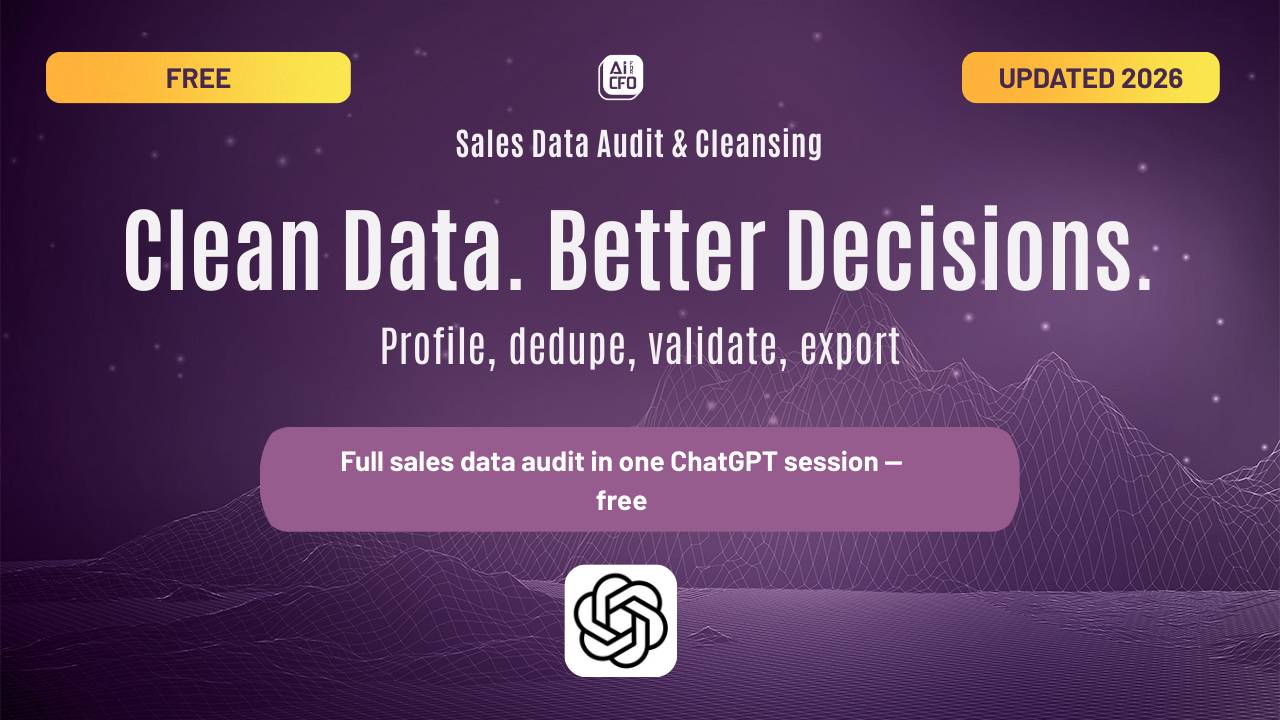 A structured, copy-paste-ready prompt sequence for running a full sales data audit in ChatGPT. Covers profiling, standardisation, deduplication, outlier detection, missing data handling, validation, audit logging, and final QA export.