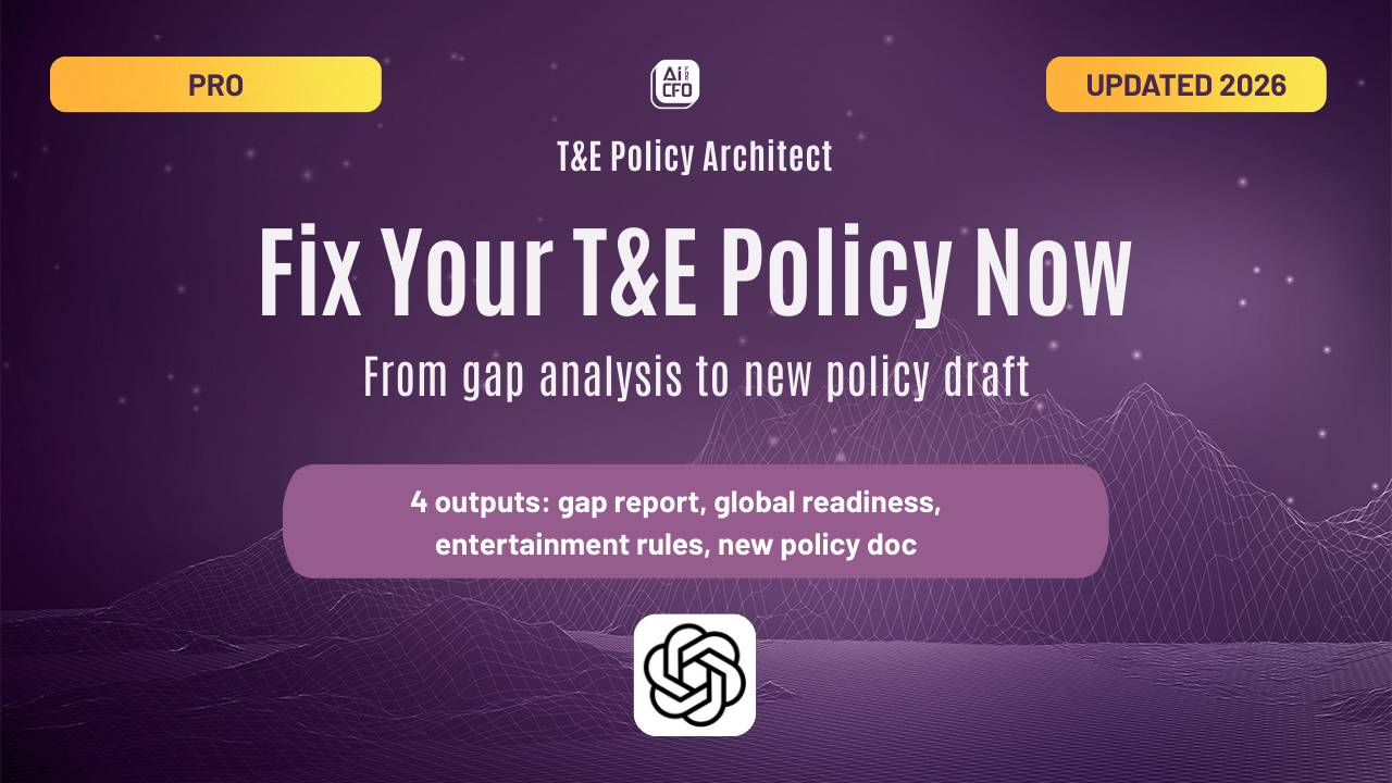 A ready-to-use prompt template for running a structured T&E policy review. Fill in the company name and target regions and paste it directly into ChatGPT to trigger all five analysis outputs.